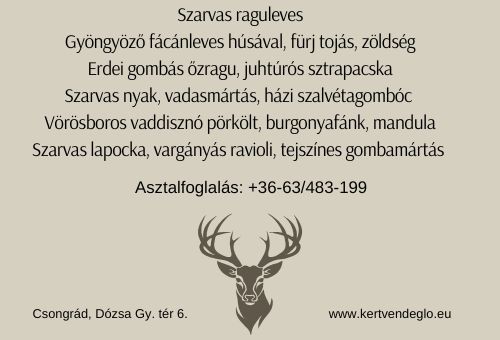 Fedezze fel éttermünket, amely Csongrád városának szívében, a gyógyfürdő közvetlen szomszédságában található. Tradicionális ételeinkkel és barátságos légkörünkkel várjuk Önt és kedves vendégeit. Legyen szó lakodalomról, születésnapról, ballagásról vagy céges rendezvényről, külső fedett teraszunk és 120 fős belső légkondicionált rendezvényhelyszínünk tökéletes választás minden alkalomra. Látogasson el hozzánk, és élvezze a Kertvendéglő Csongrád vendégszeretetét!